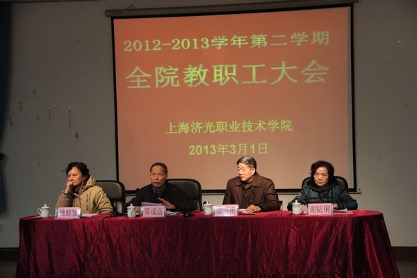 陈成澍院长传达了市高校领导干部会议精神,并结合我院实际情况,以深化体制机制改革为目的提出要求,强调全院教职工一要增强危机感、忧患意识;二要加快青年干部队伍的建设;三要规范内部管理,切实关心师生利益。同时,陈院长通报了2012年度学院主要工作成果,在获取上海市民办高校示范校创建校和特色高职院校建设校的资格、三项市级教育成果以及重点专业教学设计比赛中所取得优异成绩等一系列的基础上,全力做好2013年度的工作,以迎接评估工作、深化机制体制改革、做好招生工作和20周年校庆为重点,继续巩固我院在同类院校第一梯队的位置。副院长谢陪俐布置新学期教学工作,要求全员教职工团结一致迎评促建、加快加强专业建设、全力以赴投入招生工作,为济光学院的发展,作出自己的贡献。