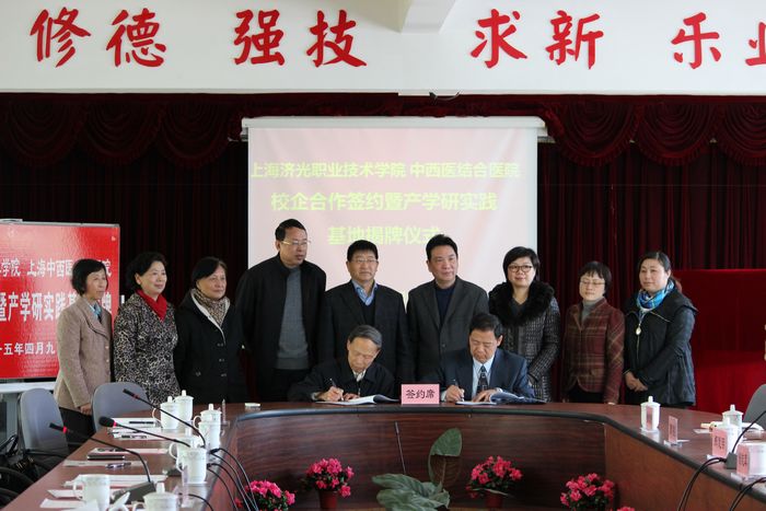 会上,与会领导观摩了济光学院20年校庆宣传片和中西医结合医院80年院庆的宣传片。双方就校企合作背景、基本框架及产学研实践的具体实施等达成共识 ,在双方领导的共同见证下,陈成澍院长与舒志军院长代表校院双方签署了合作协议,祁学银书记、郑慧明书记一起为产学研实践基地揭牌。