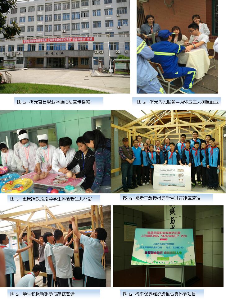 本次职业教育体验活动中我们学院共被选中了三个体验项目,分别是:建筑营造活动、奇妙的生命之旅、汽车保养维护仿真虚拟操作,同时开设了“你所不了解的职业—中国助产士”、“引领阅读•书香济光”等丰富的校园文化展示项目及为民服务活动。