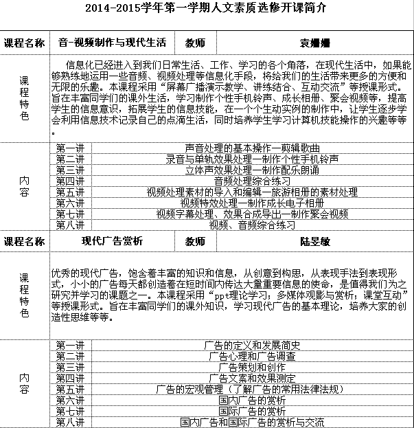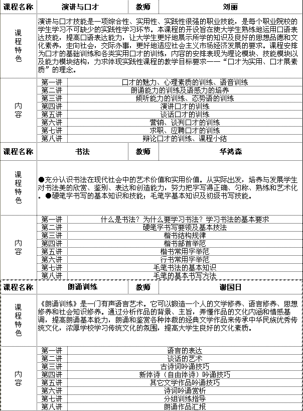 学院非常重视人文素养教育,通过开设艺术、科技、经典诵读、礼仪等相关选修课和课外活动,提高大学生的人文素养。人文素质选修课教学是实施大学生文化素质教育的一条重要渠道。所开出的选修课旨在开拓学生视野,扩大学生的知识面,提高学生的科学人文素养,陶冶情操。并且为了提高选修课教学质量,充实我院选修课科目,教务处面向全院征集人文素质选修课课程,积极鼓励青年教师开设选修课,同时聘请校外专家教师来校开讲。目前人文素质选修课程库中已开设课程:《中国古典文学作品欣赏》、《中国古代小说选读》、《摄影》、《书法》、《职业指导与就业素养》、《影视心理学》、《中国元素与广告创意》、《园林花卉》、《网页设计与制作》、《中国传统文化艺术》、《演讲与口才》、《弟子规解读》《论语选读与人生感悟》《音视频制作》《音乐赏析》等累计达35门。每个学生每学期选修不少于一门,通过开展选修课程和各种活动,我院学生的人文素养也有了明显的提高。