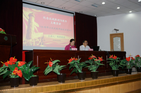 报告会以一首《松花江上》拉开序幕。会上陈教授以国歌的故事、英雄事迹、中国历史发展的记录视频等形式阐述了抗战之路的艰辛以及伟大的抗战精神,他还通过提问让同学激情高涨,引导同学们深刻认识中国人民八年浴血抗战的历史。陈教授指出,中国人民取得抗战的最终胜利,是当年两党将士浴血奋战来之不易的成果,因此我们新一代青年要通过了解历史,学习和传承民族精神,树立正确的世界观、人生观,勤奋学习,为中国梦坚持不懈地努力。