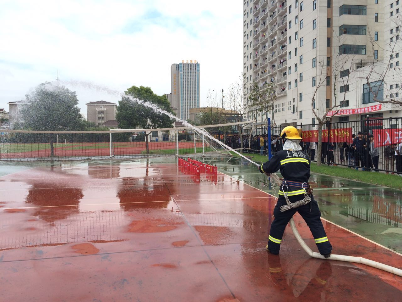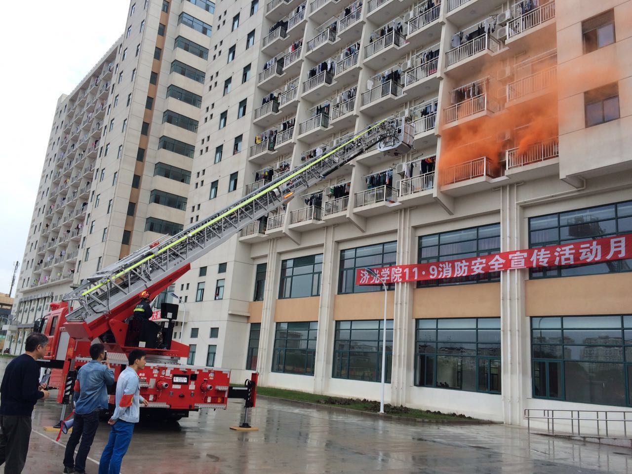 本次演练区域为1号宿舍楼的3、4、5、6、13层男生寝室。上午10点30分,消防车停至宿舍楼下,云梯车进入指定位置,民兵战士进入指定位置并做好引导楼内学生快速撤离“火灾”现场的准备。我院后保处处长凌龙、副处长金明华现场指挥,杨行消防中队14名消防官兵亲临第一线,医务室、红十字救援小组成员、火警专管警员和我院建筑系、机电系的师生共700余人参加演习。