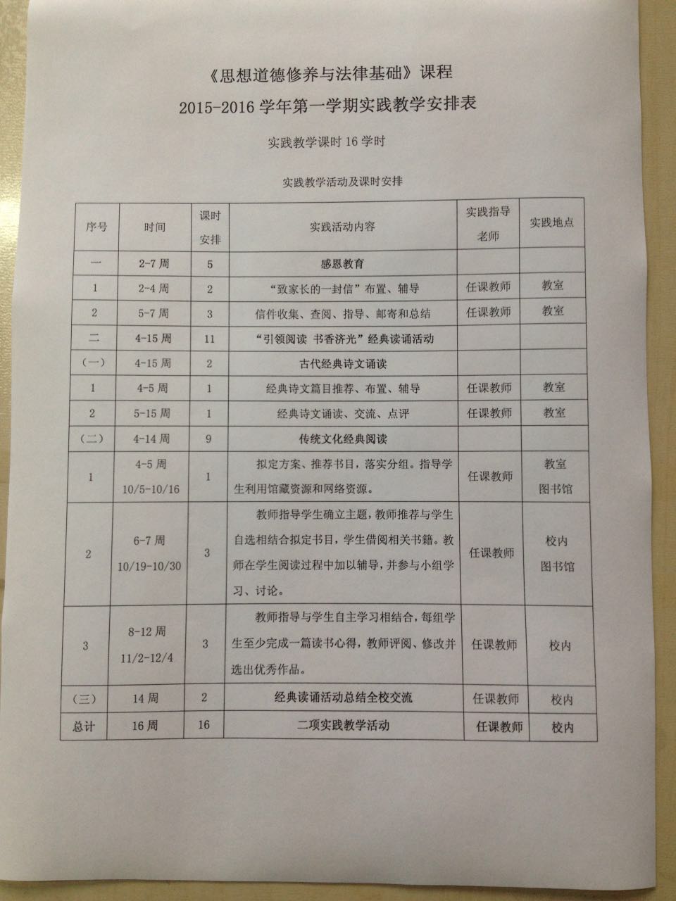 2015-2016学年第一学期实践教学安排表