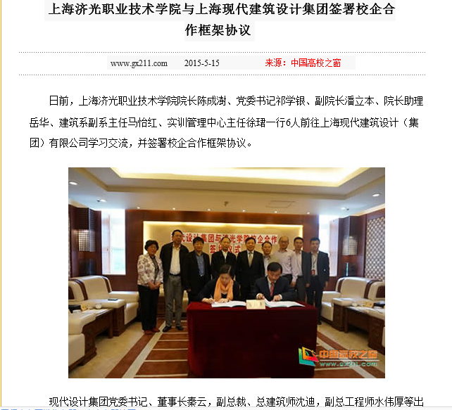 中国高校之窗《上海济光职业技术学院与上海现代建筑设计集团签署校企合作框架协议》
