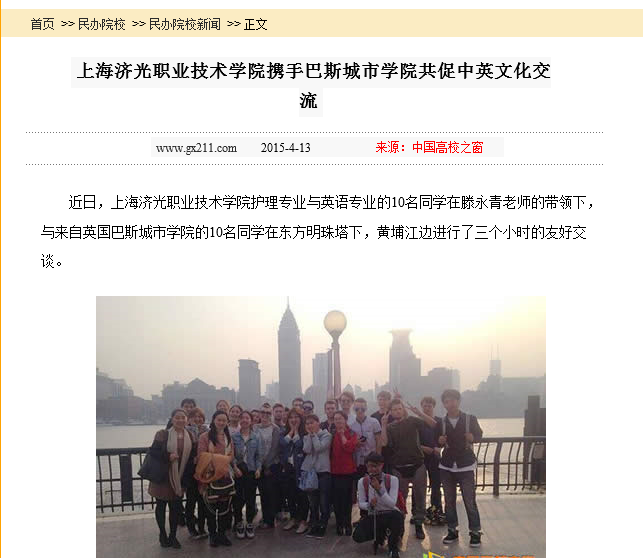 中国高校之窗《上海济光职业技术学院携手巴斯城市学院共促中英文化交流》