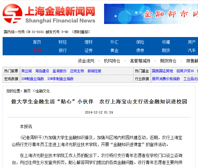 上海金融新闻网《做大学生金融生活“贴心”小伙伴 农行上海宝山支行送金融知识进校园》