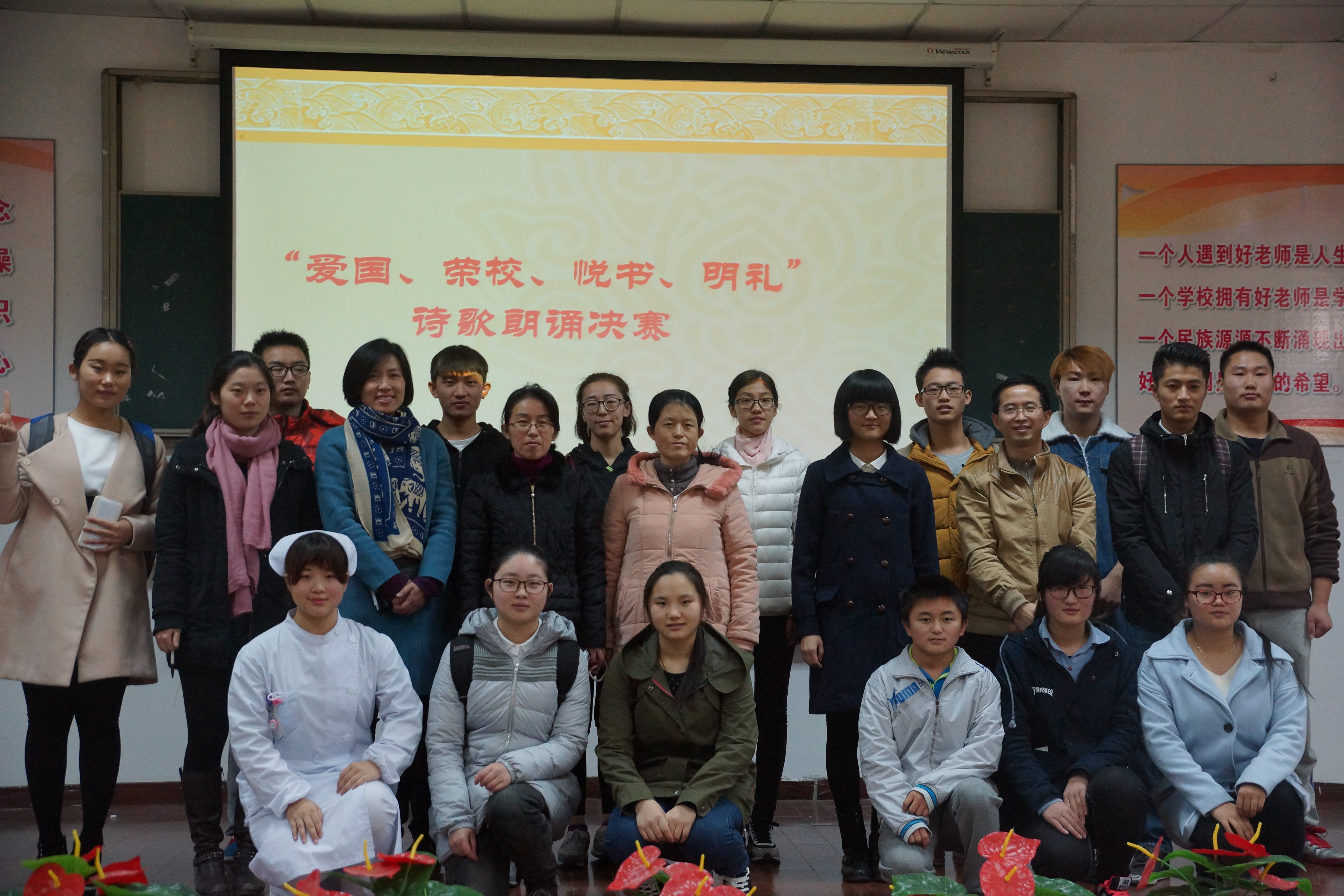由团委主办、悦书明礼社承办的以“爱国、荣校、悦书、明礼”为主题的朗诵大赛决赛11月27日下午在第一阶梯教室顺利举行。学生处处长王琛老师,评委团团委副书记吴海燕老师、教务处王阳华老师、思政部姜洁晶老师、悦书明礼社指导老师思政部谢国日老师、悦书明礼社社长朱聪聪同学,以及社团成员和来自各系的观众出席了本次活动。
