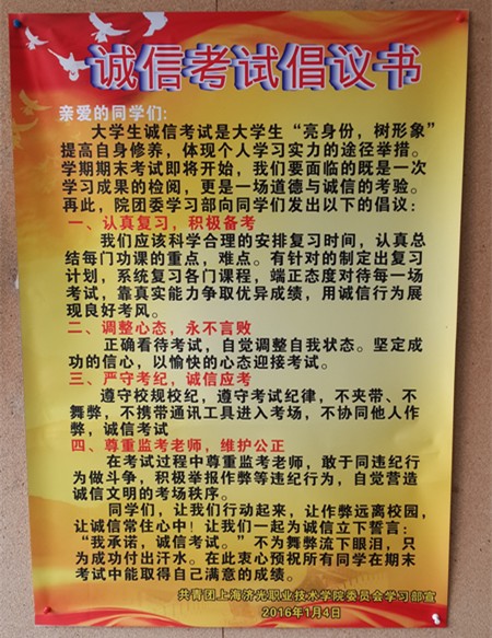 现在正值本院学风建设月,考风考纪作为着力点更是重中之重,而诚信是个人立足之本,它在即将到来的期末考试中显得尤为重要。每位学生都应力所能及地对身边的同学进行“诚信考试”的教育和引导,及时劝诫或制止考试作弊行为的发生,以实际行动为诚信校园的建设做出一份贡献。