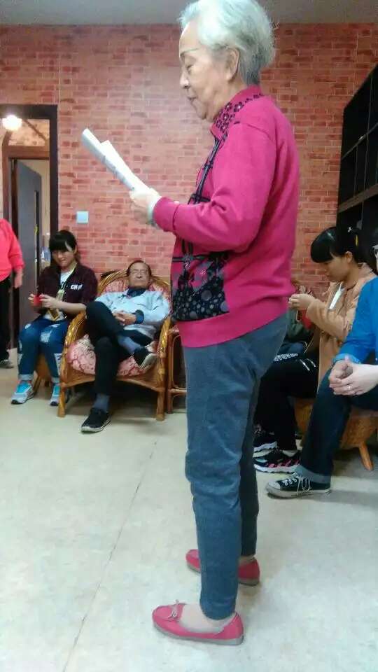 刚一进去就看到许多老爷爷老奶奶在哪里,有的坐在桂花树下,有的围着石桌,有一个老爷爷还在锻炼,我们和那个老爷爷聊会天,老爷爷向我们介绍一下这里的情况,原来这里的老爷爷老奶奶有很多身居残疾,有的眼睛不好,有的听力不好,有的腿脚不好,有的甚至脑子不好.......听我们不禁心头一怔,心情不禁有点忧伤,随后我们和坐在桂花树下的老奶奶们说话,奶奶们很热情,有一个老奶奶竟还是我的同乡,随后奶奶们提议我们唱几首歌听,幸好我们有备而来。老奶奶们都高兴的笑了还给我们鼓掌。在随后的聊天中我知道了他们的儿女大多都忙,我下定决心以后不管我在怎么忙也要经常陪爸爸妈妈,决不让他们孤单。