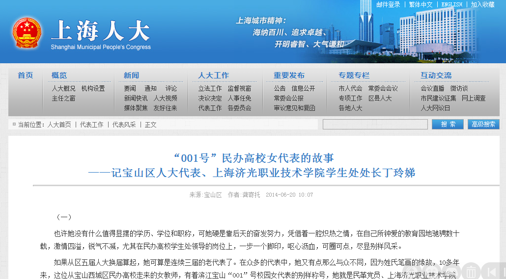 上海人大官网《“001号”民办高校女代表的故事——记宝山区人大代表、上海济光职业技术学院学生处处长丁玲娣》