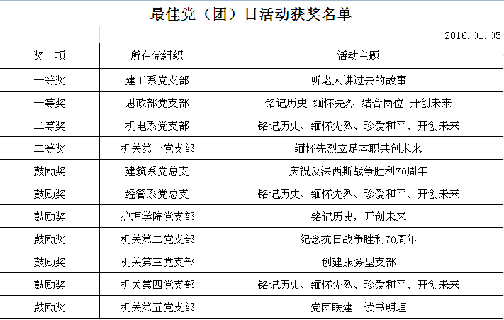 为纪念中国人民抗日战争暨世界反法西斯战争胜利70周年,激发师生的爱党、爱国、爱校热情,营造良好的校园氛围,学院开展了以“铭记历史、缅怀先烈、珍爱和平、开创未来”为主题的党、团专题组织生活活动。学院对各党、团组织开展的主题活动进行了评选,共评出“最佳党(团)日活动”一等奖2项,二等奖2项,鼓励奖7项。