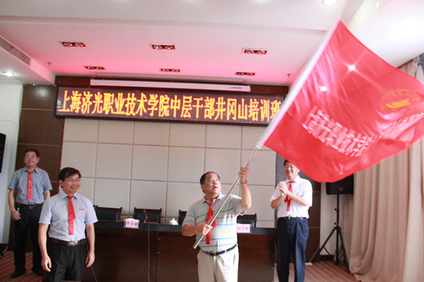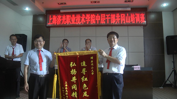 党委书记祁学银代表全体学员向井冈山大学赠送“追寻红色足迹 弘扬井冈精神”十二字锦旗。随后,井冈山大学校长曾建平将象征着革命圣火的旗帜交给李永盛院长手上。鲜红的旗帜是革命精神的焕发,旗帜的挥舞进一步激发了培训班学员们的热情。