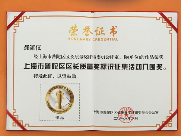 同时,建筑系广告设计与视觉艺术专业的数名教师全程对学生进行了悉心的指导,建筑系特聘教授朱钟焱老师也作为专家参与了评审工作。为感谢我院大力支持并积极参与此次活动,我院被上海市普陀区区长质量奖评审委员会办公室授予 “上海市普陀区区长质量奖标识征集活动优秀组织奖”荣誉称号。