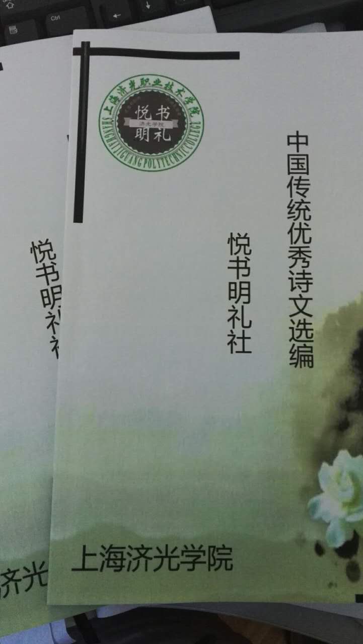 2016年5月,获悉2016年上海市大学生社团文化扶植计划“大学生社团优秀项目”的通知后,思政部教师谢国日召集他指导的社团——悦书明礼社骨干成员召开讨论会,经过多次商讨后,结合社团的性质和已有基础,申报了一个文化类项目——“中华优秀传统诗文诵读与传承”,经过项目组师生的努力,该项目在6月获批,社团因此还获“上海市十佳大学生人气社团”称号。经过项目组师生三个多月的努力,于9月初,项目成果之一《中华优秀传统文化选编》编撰成册,为后续诵读小组开展诵读奠定了扎实的基础。