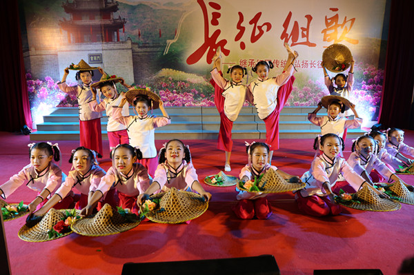 18点30分,“万泉河水清又清,我编斗笠送红军……”伴着熟悉的旋律,杨行小学的16名学生踏着轻快的舞步走来,拉开整场晚会的序幕。随后,院团委书记刘紫光以朗诵的形式,将全场观众带入了长征组歌,各院系唱响五大华美乐章。