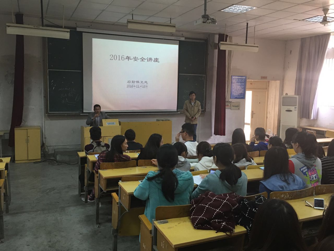 2016年安全月活动中,学院开展了各类安全讲座,包括人身财产安全、消防安全、交通安全、校园贷的危害等,系部参与率100%。