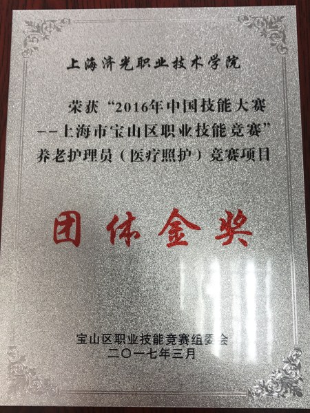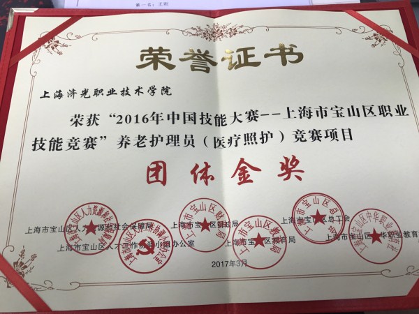 会上,市、区领导为宝山区技能竞赛活动“个人奖”、“优秀组织奖”和“优秀展示奖”颁发证书,我院多个项目受到表彰:首次被评为“宝山区技能培训鼓励单位”,由继教院和护理学院精心打造的“养老护理员(医疗照护)”项目获得“2016年中国技能大赛――上海宝山区职业技能竞赛”团体金奖;护理学院15级学生孙丹丹获得“2016中国技能大赛――上海市宝山区职业技能竞赛”养老护理员(医疗照护)竞赛第一名。