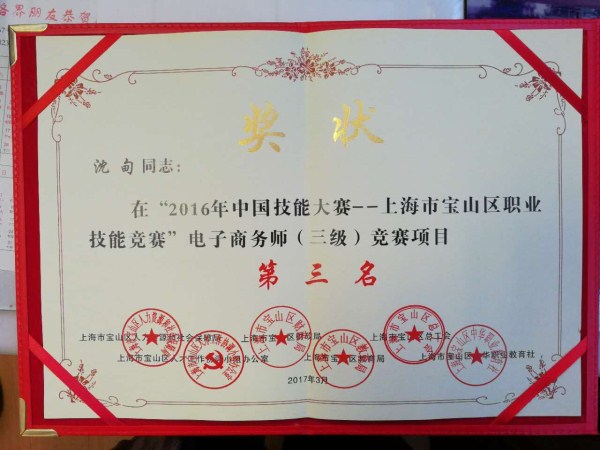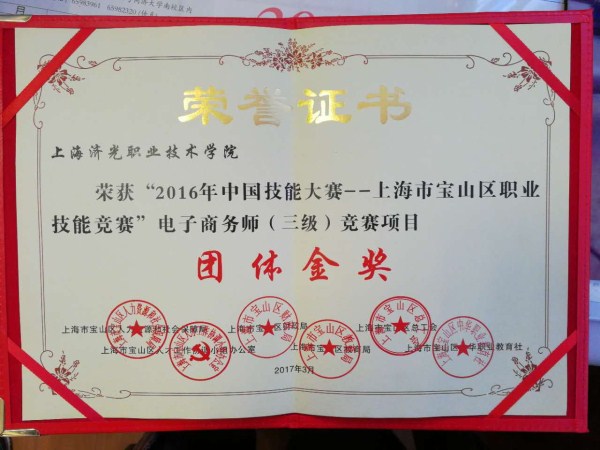 历时五个月,由宝山区人力资源和社会保障局联合区委组织部、区财政局、区教育局、区总工会等部门共同举办的2016年中国技能大赛――上海市宝山区职业技能竞赛电子商务(高级/三级)项目近日公布结果,我院经管系林俊、李娜、沈甸、宁苗苗组成的教师团队代表济光学院喜获团体金奖。其中,沈甸老师获得电子商务(高级/三级)项目个人第三名的优异名次。全体教师均获得由上海人社局颁发的电子商务(高级)证书。