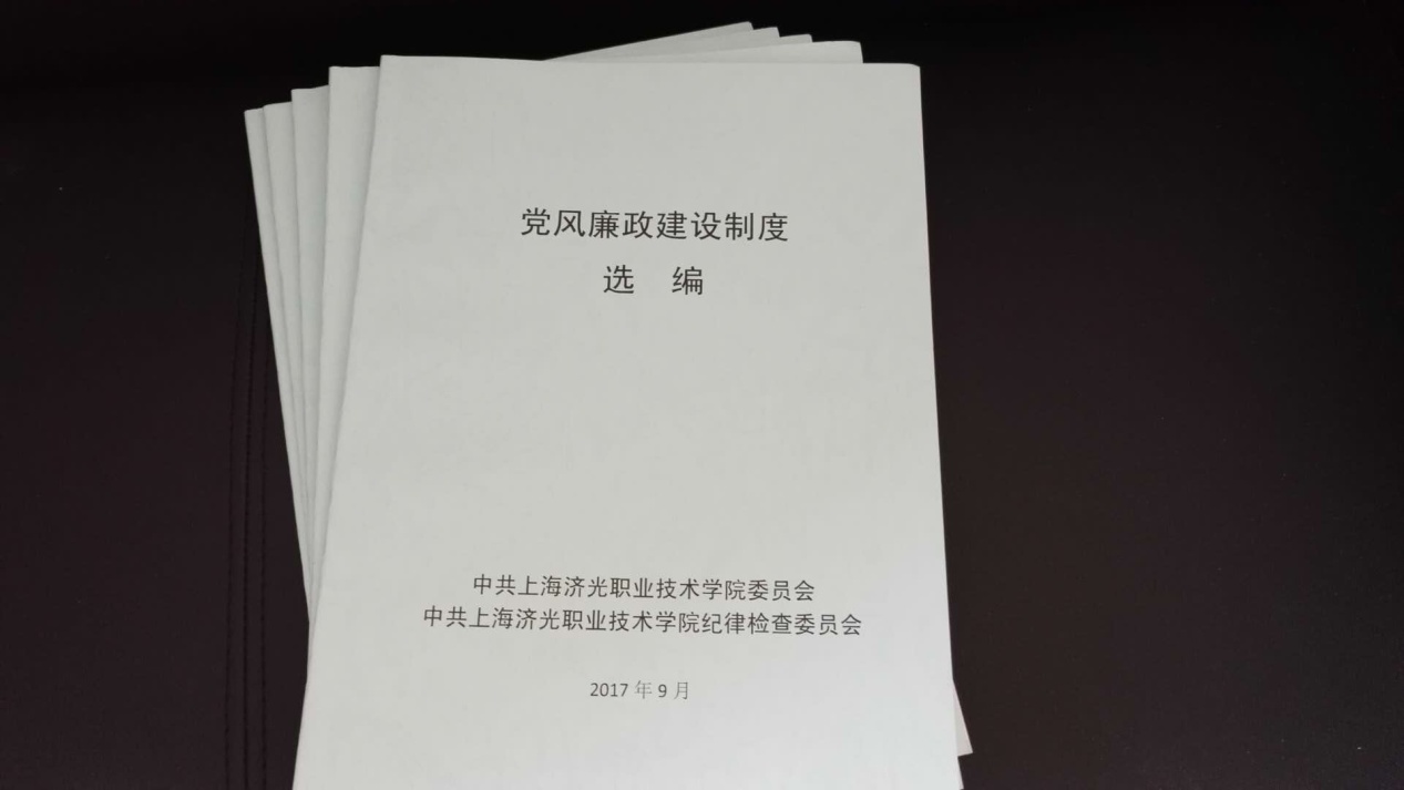 2017年学院编制《党风廉政建设制度选编》第一部分上级有关文件有关党政机关国内公务接待管理规定等四个文件,第二部分 学校党风廉政建设制度有关中共上海济光职业技术学院委员会贯彻落实党风廉政建设责任制的实施意见等四个文件。加强制度建设,规范和完善工作流程,尤其对招生录取、基建工程、设备采购、财务等重点岗位明确责任制,规范权力运行。