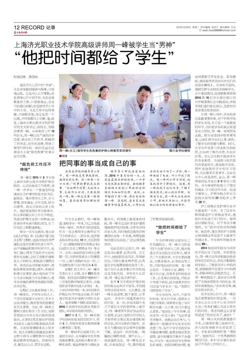 他是师生心目中的“男神”,他是“最美教师”,他“把时间都给了学生”,他就是我院护理学院周一峰老师。2018年5月9日的《东方教育时报》“记录”专栏报道了我校护理学院周一峰老师,记录了他在平凡岗位上朴实的工作点滴。