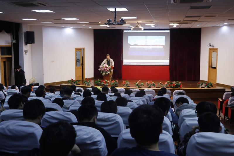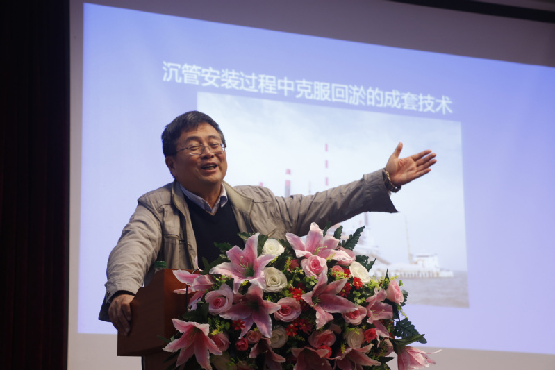 作为中国建筑史上里程最长、投资最多的世纪工程,港珠澳大桥岛隧工程的难度史无前例。会议伊始,徐伟老师播放了“南京长江第四大桥”地连墙的施工动画。接着,徐教授深入浅出地向同学们介绍了港珠澳大桥隧道工程设计施工中遇到的难题:1.如何在外海成岛;2.如何选取沉管隧道的基础形式;3.如何制作沉管;4.如何安装沉管;5.如何做外海中的沉管安装。