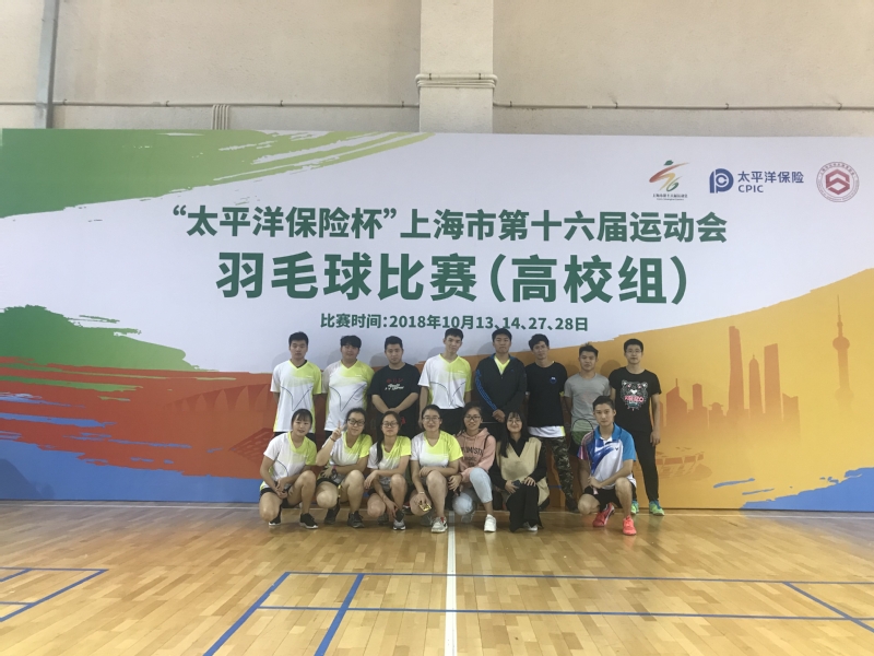 2018年10月13、27、28日,上海市第十六届运动会,高校组羽毛球比赛在同济大学举行,秦磊刚老师带队,由房金徽、朱冬梅等16位同学组成的羽毛球代表队参加了高校组的男团、女团及个人单项赛的所有比赛。在比赛中,面对上海各大名校强劲对手,我院参赛同学不畏艰难,奋力拼搏,团结互助,赛出了我校学生积极进取、坚韧不拔、越挫越勇的精神风貌。
