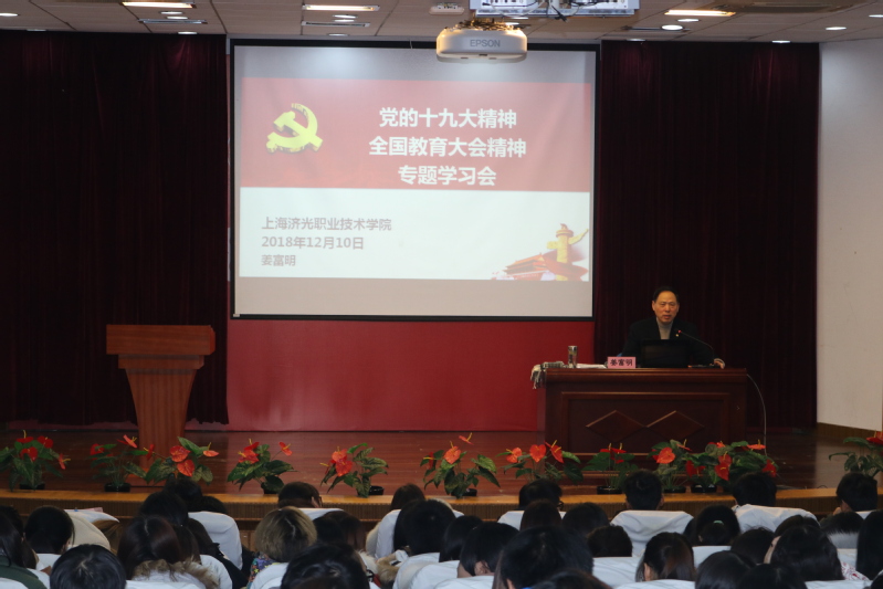 12月10日上午,党委书记姜富明走上讲台,为济光学子作了题为“学习党的十九大精神和全国教育大会精神”专题讲座,深入学习领会党的十九大精神、全国教育大会精神,引领大学生们更好地把握习近平新时代中国特色社会主义思想。 姜富明书记分别从一个“历史使命”“重大思想”、两个“重大判断”“重要时期”“阶段”(两步走)、四个“伟大”、五个“自觉”、七个“战略”、八个“明确”、九个“指导”、十个“历史性成就”和十四条“基本方略”等十二个方面对党的十九大精神进行详尽分析和深入解读,他勉励学生努力学习成才,号召大家积极投身到全面建成小康社会的伟大实践和实现中华民族伟大复兴的中国梦的历史使命中。 姜书记结合全国教育大会精神对我院青年学子提出三点要求:人生要敢做梦、勇追梦,要确立自信心,明确人生奋斗的目标,通过自身努力学习,在投身实现中国梦的过程中实现个人的青春梦;人生要肯奋斗能吃苦,要在刻苦学习、苦练技能、学会创新、学会做人和学会交流中经历奋斗的青春,努力做新时代的高素质技术技能型人才;人生要讲奉献有作为,高职学生凭借着对职业技能的完美和极致的追求依然可以成为一个领域不可或缺的人才。 在报告中,姜富明书记希望同学们能够培养自我管理能力、职能技术能力和沟通交流能力,具有边界意识、规则意识、目标意识、合作意识和实干意识,在新时代中国特色社会主义建设中创造自己的精彩人生。