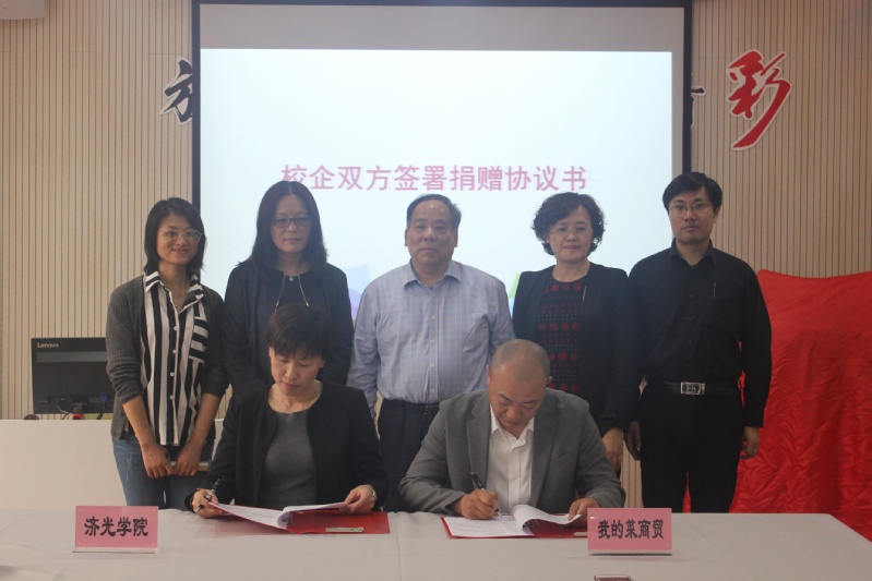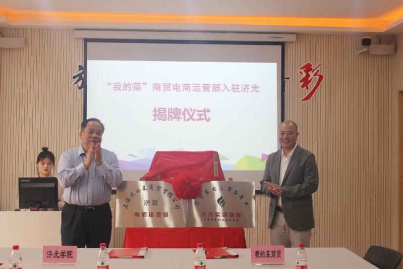 揭牌仪式于下午一点准时拉开了序幕,经管系主任张迺英老师首先介绍了我院经管系电子商务专业与上海“我的菜”商贸有限公司项目合作的基本概况,从最初的企业课堂植入、企业讲座和企业真实项目课堂导入,到今天的企业入驻,是校企双方探讨共同育人的新模式。随后,在师生们的见证下,学生处处长王琛与 “我的菜”商贸CEO王小晶先生签署捐赠协议书。李永盛院长和“我的菜”商贸CEO王小晶先生共同为 “我的菜”商贸有限公司入驻济光进行了揭牌,李永盛院长还在济光经管公众号线上启动了首届“集才杯”短视频电商大赛。