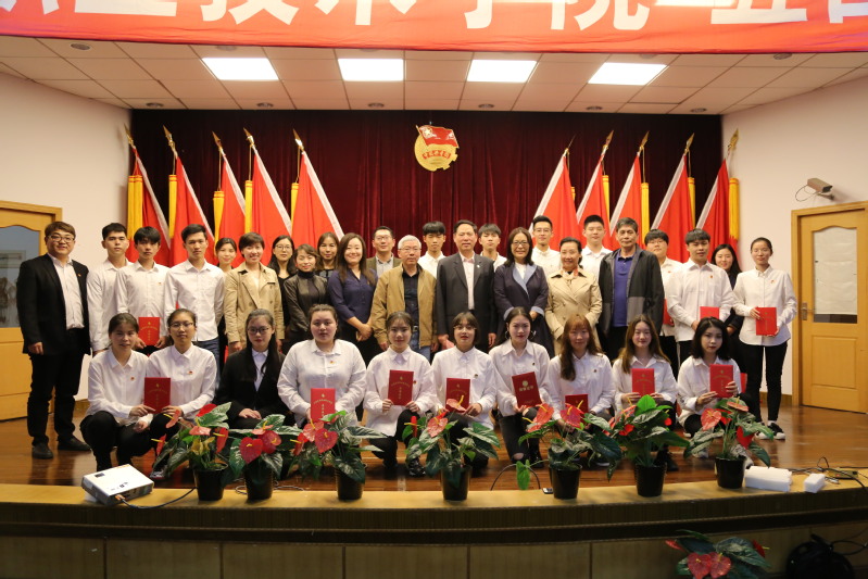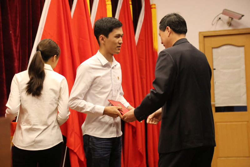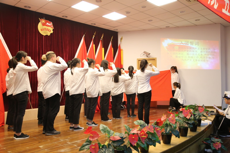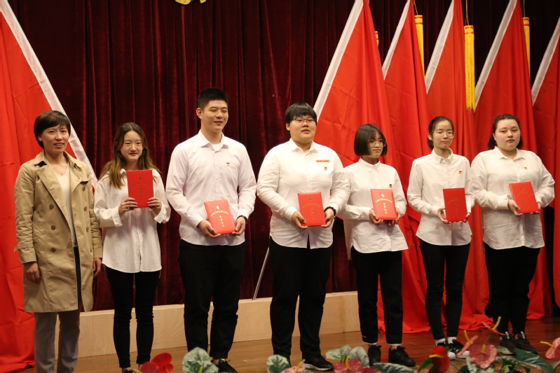 新团员代表在大会师生的见证下庄严宣誓、光荣地加入中国共产主义青年团、院党委书记姜富明为新团员颁发团员证以及团徽。