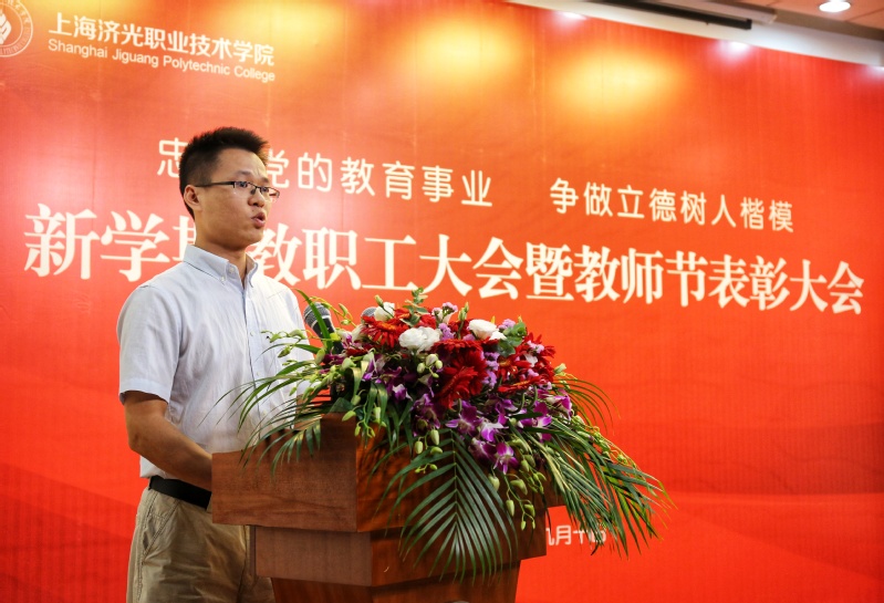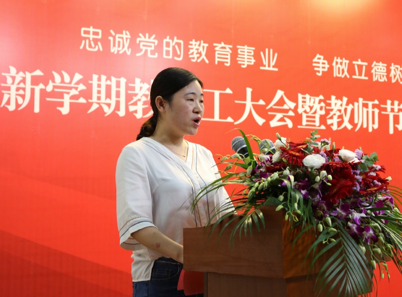 随后,四位来自教育教学和服务岗位一线的获奖教师代表上台交流发言。建工系教师葛东霞作为一名有29企业工作经历的“年轻”教师,始终坚信教育的规律,努力践行用心教、以行范、爱学生、重引导的理念,并分享了教学实践中的感想感悟。与教师节共庆35岁生日的机电系教师陈斌分享了他的执教信念:全身心投入教育事业,努力工作,不断进取,尽我所能,让每一个学生能成社会可用之才,让每一个家长放心。建筑系辅导员何晶晶从学生管理的角度出发,阐述了自己在辅导员岗位上的经验:用自己的言行感染学生,用自己的行动激励学生,用一颗真诚的心对待学生,平凡的我们用最真挚的爱做好每一件最平凡的事,引领着学生们在思想上成熟、行动上成人,学习和事业上成才。招生办的朱敏华老师号召全体教职工在新的学年里,继续不忘初心、牢记使命,立足本职、脚踏实地,为学校再上新台阶而努力工作。