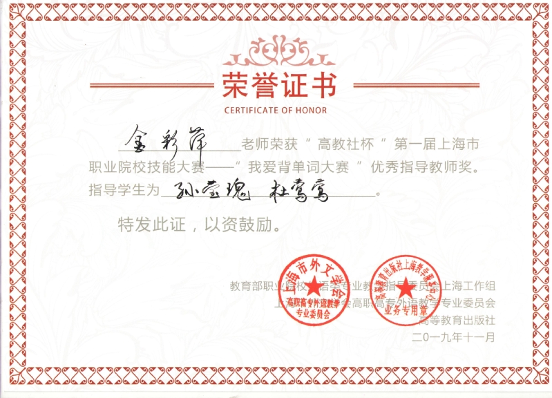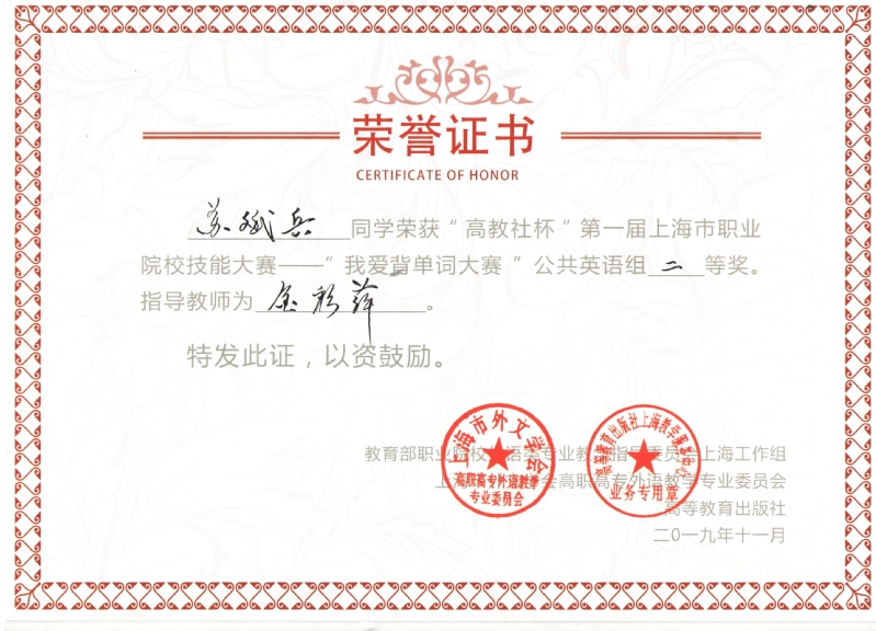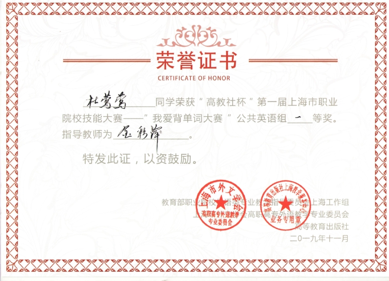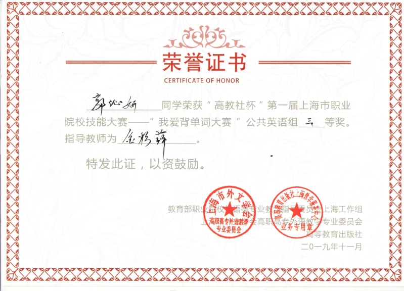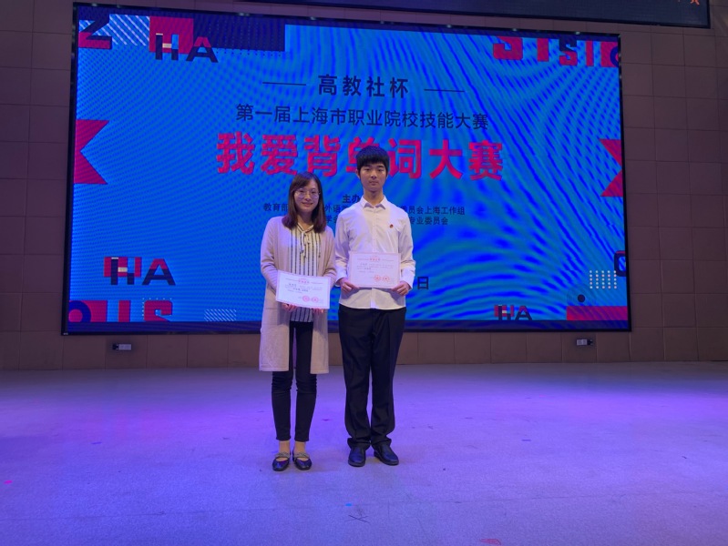 11月17日,“高教社杯”第一届上海市职业院校技能大赛“我爱背单词大赛”在工商外国语学校拉开帷幕。经过两轮的激烈比拼,18级护理国际班的孙莹瑰同学获得特等奖,18级会计2班的杜莺莺同学获得一等奖,18级汽车检测与维修班的苏斌兵、19级会计2班的柳詠尹获得二等奖,19级报关与国际货运班的郭沁妍获得三等奖,基础部公共英语组的金彩萍老师获得优秀指导教师奖。