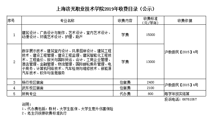上海济光职业技术学院2019年收费目录(公示)
