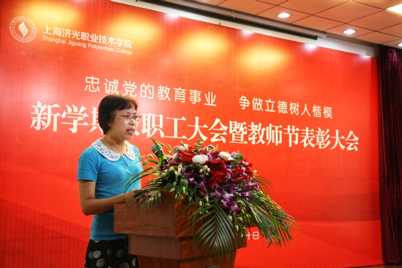 姜富明书记宣布会议正式开始并传达2019年秋季上海高校党政负责干部会议精神。随后,全院教职工共同观看视频《忠诚党的教育事业 争做立德树人楷模——学院2018-2019学年教职工教书育人成果集锦》,回顾了过去一年以来济光园丁们在教育教学成果和收获,院长助理、院系部负责人为获得市级以上荣誉的教职工代表献花。