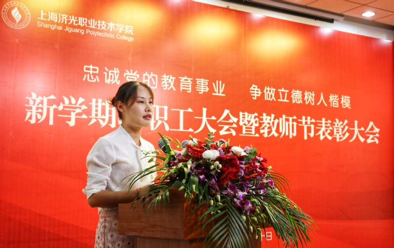 随后,四位来自教育教学和服务岗位一线的获奖教师代表上台交流发言。建工系教师葛东霞作为一名有29企业工作经历的“年轻”教师,始终坚信教育的规律,努力践行用心教、以行范、爱学生、重引导的理念,并分享了教学实践中的感想感悟。与教师节共庆35岁生日的机电系教师陈斌分享了他的执教信念:全身心投入教育事业,努力工作,不断进取,尽我所能,让每一个学生能成社会可用之才,让每一个家长放心。建筑系辅导员何晶晶从学生管理的角度出发,阐述了自己在辅导员岗位上的经验:用自己的言行感染学生,用自己的行动激励学生,用一颗真诚的心对待学生,平凡的我们用最真挚的爱做好每一件最平凡的事,引领着学生们在思想上成熟、行动上成人,学习和事业上成才。招生办的朱敏华老师号召全体教职工在新的学年里,继续不忘初心、牢记使命,立足本职、脚踏实地,为学校再上新台阶而努力工作。