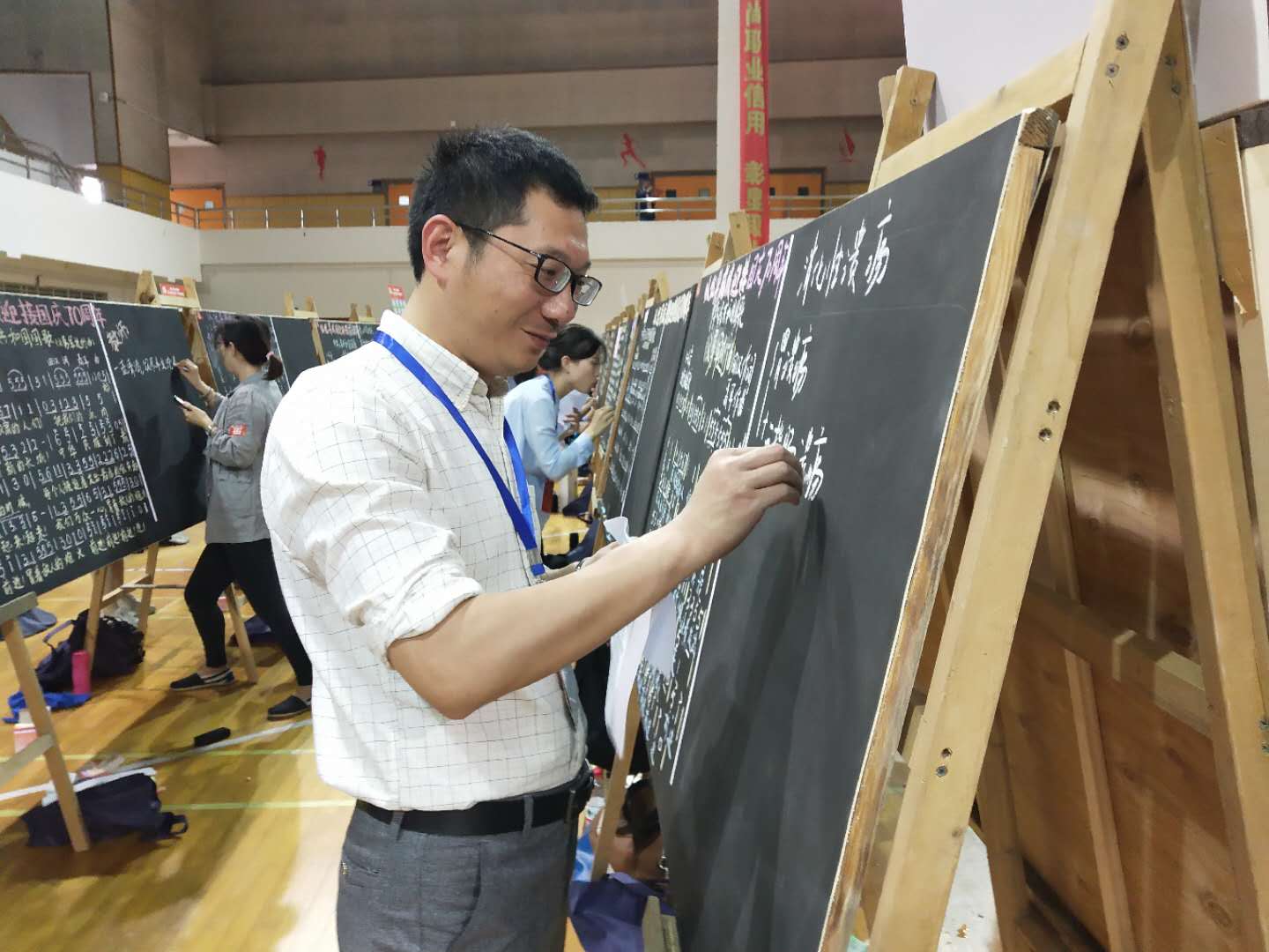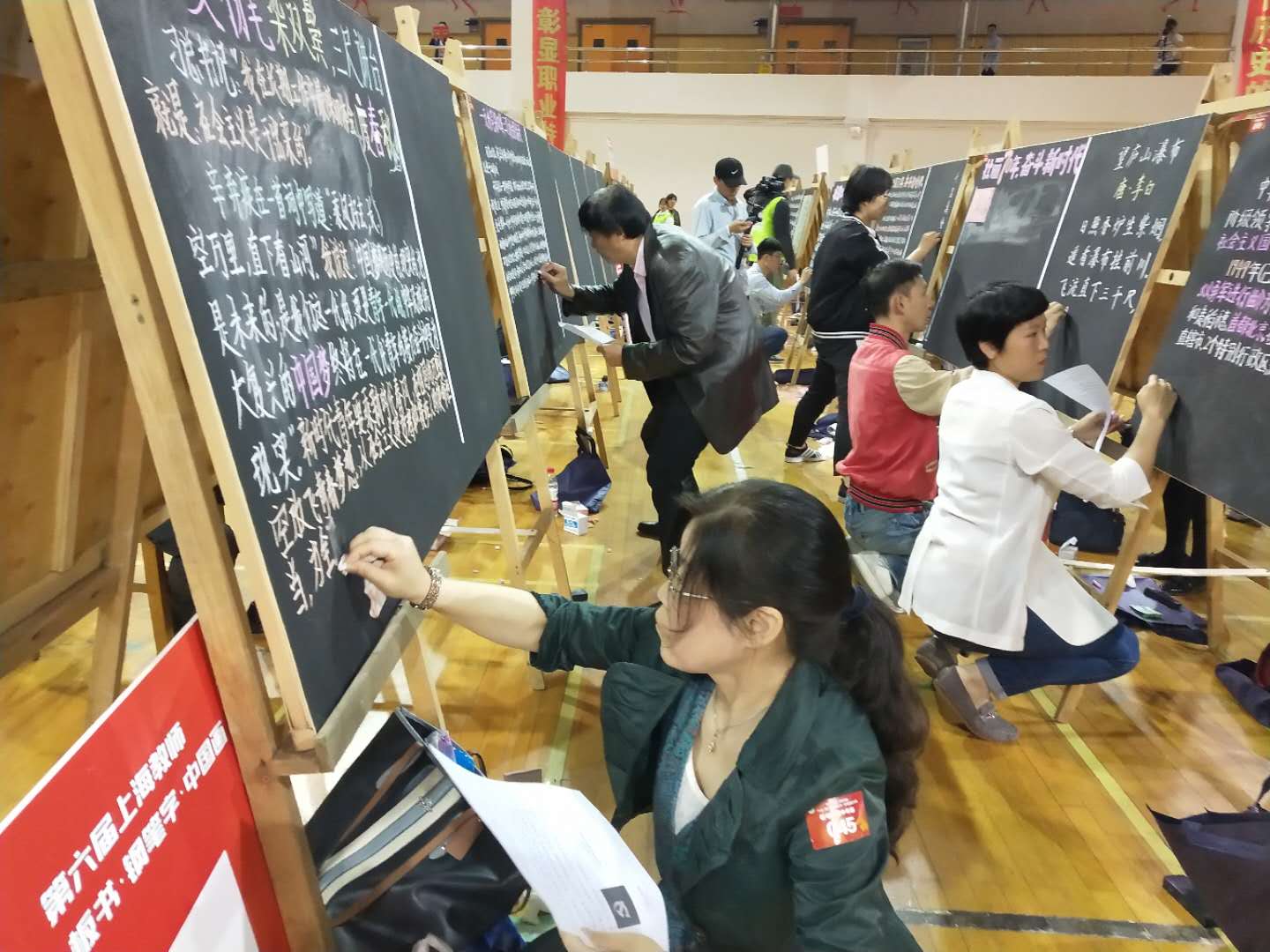 5月11日第六届上海教师书法·板书·钢笔字·中国画大赛在上海第二工业大学开赛。我院有九位老师在工会主席王滟带领下参加比赛。来自上海市教育系统42所高校、16个区县、36所中职校共计1034位教师选手,分别参加书法、板书、钢笔字、中国画4个比赛项目中年组和青年组的比赛。党中央、国务院2018年联合发文,提出要强化教师钢笔字、毛笔字、粉笔字等教学基本功,今年的参赛人数再创新高。大赛由上海市教育工会主办,希望通过这次活动,激励教师,写出最新的文字,绘出最美的图画。2、5月11日上海第六届教师书法·板书·钢笔字·中国画大