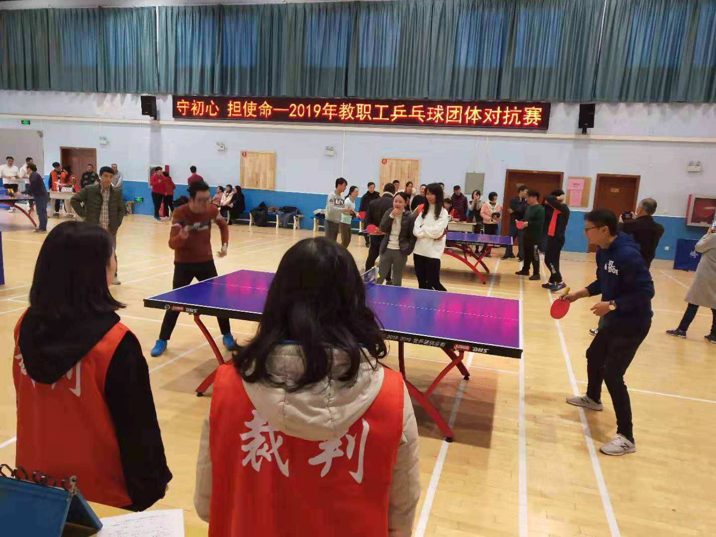 12月6日,学院2019年教职工乒乓球团体对抗赛在体育馆举行。此次活动结合学校“不忘初心、牢记使命”主题教育,以“守初心、担使命”为主题,通过体育比赛活动为教职工搭建强身健体平台。李永盛院长为此次活动致辞,并参加比赛前的乒乓球热身赛,为参赛全体运动员们加油助威。各院系部门工会主席积极组织运动员参赛,党政工负责人亲自到场参加比赛,激发了参赛运动员拼搏精神,场外教职工热情的加油声也给场上的运动员注入了激励动力。最终,第一名机关第四部门工会、第二名建筑系部门工会、第三名建工系部门工会、第四名护理学院部门工会。此次乒乓球比赛活动由学院工会、基础部部门工会共同举办。