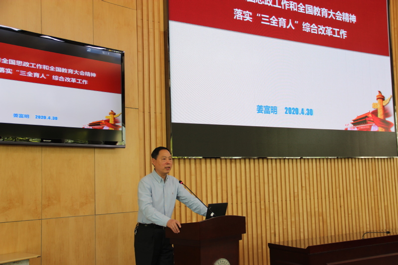 会上,姜富明书记作《贯彻全国思政工作和全国教育大会精神 落实“三全育人”综合改革工作》专题报告。姜书记首先介绍了“三全育人”综合改革的背景,并强调“三全育人”综合改革工作要以习近平新时代中国特色社会主义思想为指导、以“四史”学习教育为动力、以理想信念教育为核心、以社会主义核心价值观为引领、以立德树人为根本任务。随后,姜富明书记详细解读了“三圈三全十育人”内圈、中圈、外圈的详细内涵,指出要全面统筹学校教育教学各环节、人才培养各方面育人资源和育人力量,建立常态协同和分工负责机制,将“三全育人”贯穿于学校实施治理体系和治理能力“双高计划”建设工作之中,构建一体化育人体系。