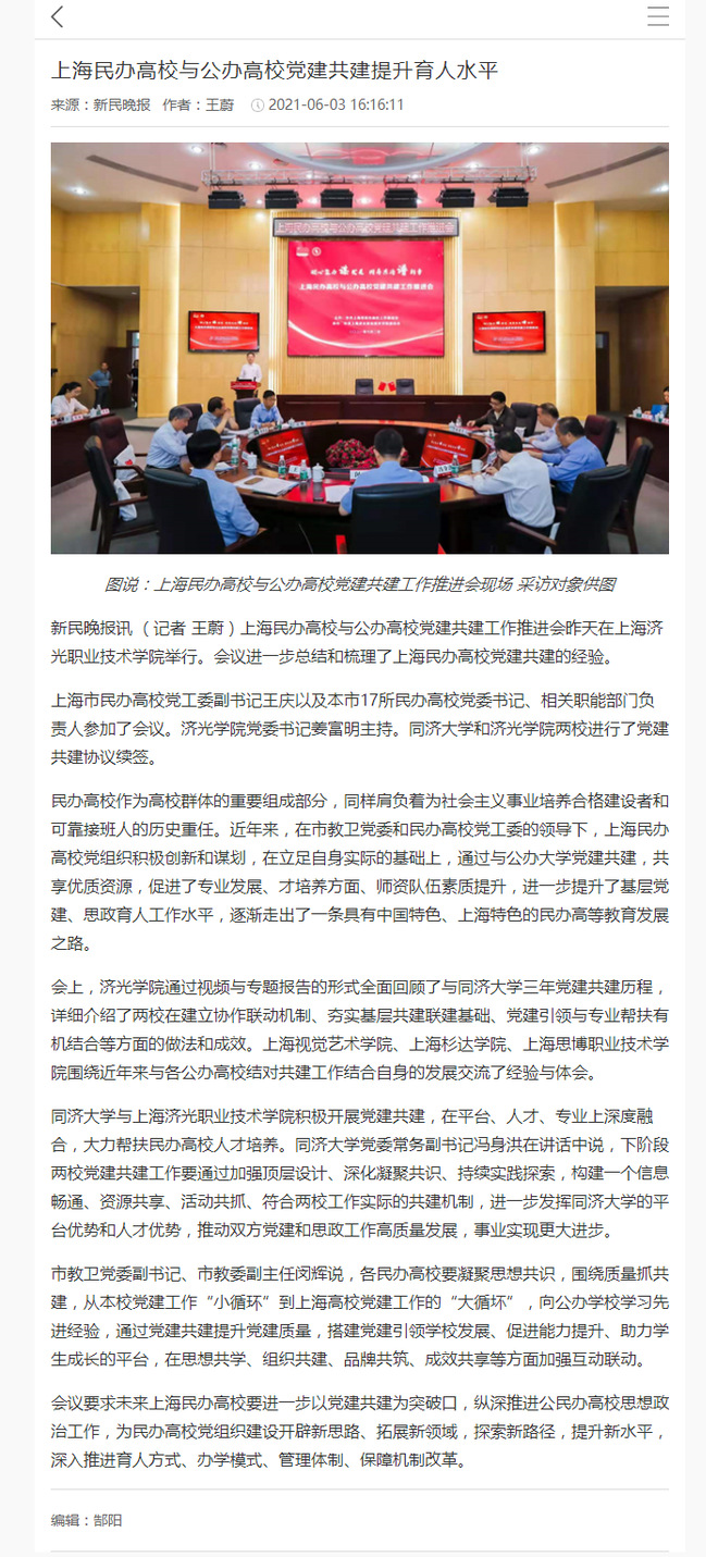 《新民晚报》客户端以《上海民办高校与公办高校党建共建提升育人水平》为题报道在我院举行的上海民办高校与公办高校党建共建工作推进会