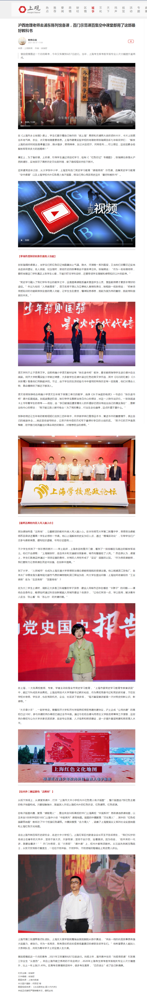 《上观新闻》6月7日“教育在线”文章《沪西地理老师去浦东陈列馆备课,百门示范课百集空中课堂都用了这部最好教科书》报道提及了同济大学与我院“大手拉小手”党建共建工作。