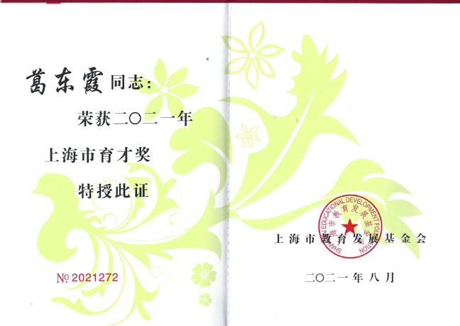 “上海市育才奖”由上海市教育发展基金会于1995年设立,是为鼓励本市长期从事高教事业,在教育教学、科学研究、教育管理工作中做出突出贡献的教师和教育工作者。近日,上海市教育发展基金会公布了2021年“上海市育才奖”获奖教师名单,我院建工系葛东霞老师获此殊荣。
