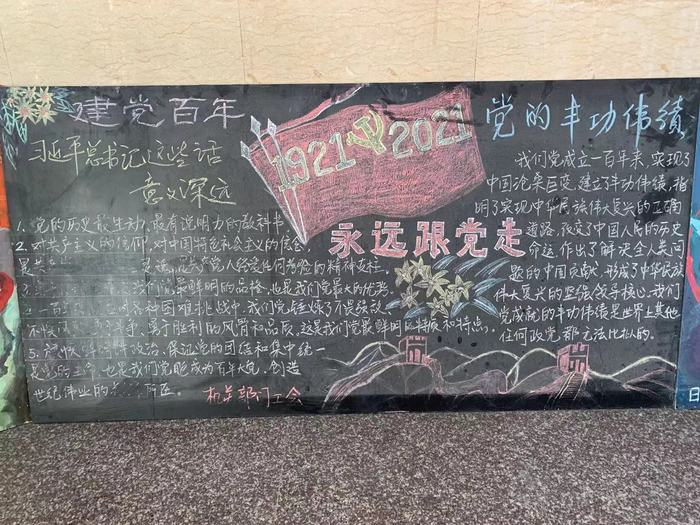 各部门工会围绕主题,充分利用黑板报这块宣传阵地,用心构思,精心设计,完美展现。一块块板报既有介绍党的历史,又有讴歌党的丰功伟绩……一幅幅精美、内容充实的板报作品,汇集了各部门工会的集体智慧,也体现了对中国共产党的崇高敬意。