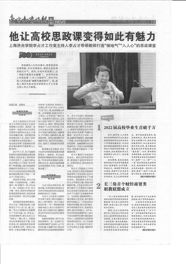 2021年12月8日,《东方教育时报》三版以《他让高校思政课变得如此有魅力 上海济光学院李占才工作室主持人李占才带领教师打造“接地气”“入人心”的思政课堂》为题,报道了我院李占才工作室主持人李占才教授。