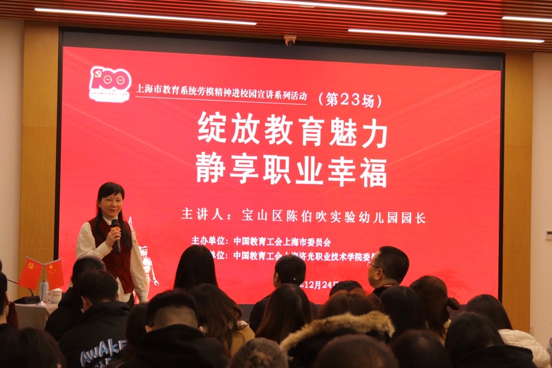 劳模精神引领时代发展,奋斗力量凝聚责任担当。为深入贯彻落实习近平总书记重要讲话精神,培育和践行社会主义核心价值观,大力弘扬劳模精神和劳动精神,引导广大师生牢固树立依靠劳动创造美好未来,托起中国梦的坚定信念,唱响“劳动光荣、创造伟大”的时代主旋律。12月24日,由上海市教育工会主办,上海济光职业技术学院工会承办的“劳模精神进校园”宣讲活动(第二十三场)在我院杨浦校区学前教育系举行。全国先进工作者,全国先进教育工作者,全国特色教育先进工作者,上海市劳模,上海市特级教师,上海宝山区陈伯吹实验幼儿园园长方红梅以“绽放教育魅力,静享职业幸福”为题,与学前教育系的师生面对面,零距离讲故事,话学习,谈感悟,促行动。学院工会主席王云飞及学前教育系师生代表共同聆听了讲座,报告会由工会常务副主席王滟主持。
