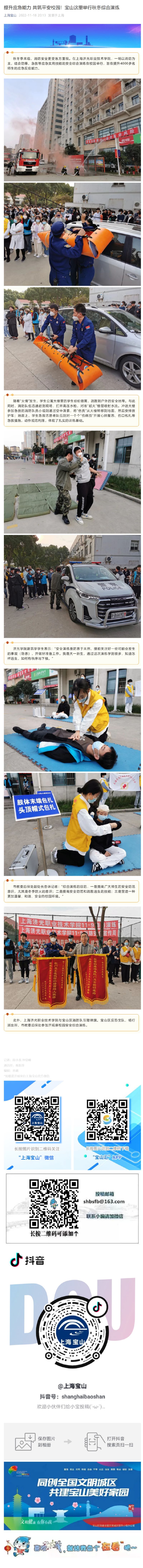 11月18日,上海宝山发布微信公众号平台以标题《提升应急能力共筑平安校园!宝山这里举行秋冬综合演练》报道了在我校举行的一场以消防为主,结合防爆、急救等应急实用技能的安全综合演练。