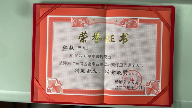 喜讯:杨浦校区管委会江毅荣获“2022年度杨浦区企事业单位治安保卫先进个人”荣誉称号