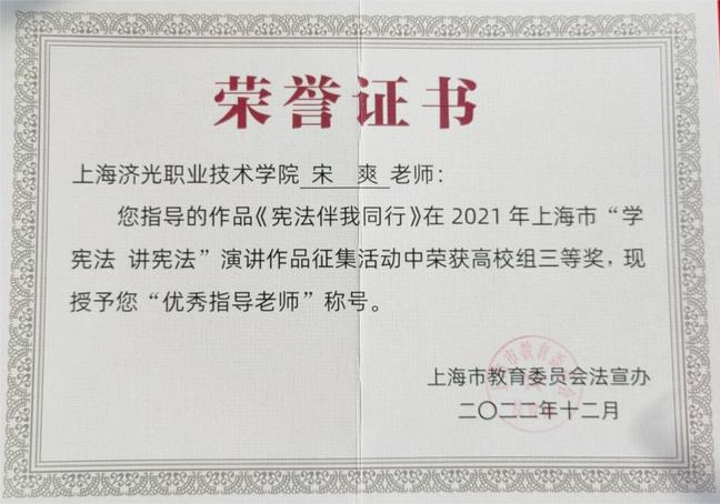 本次比赛经上海市各高校初赛选拔,共有来自华东政法大学、同济大学、华东师范大学等31所高校的大学生参加决赛。我校陈晨同学结合国家法治进程及个人成长经历,运用生动感人的事例,声情并茂地讲述宪法故事、诠释宪法精神,充分展现了当代大学生积极向上的青春风采和广博深厚的法律素养,荣获三等奖,宣传部宋爽老师荣获优秀指导教师奖。