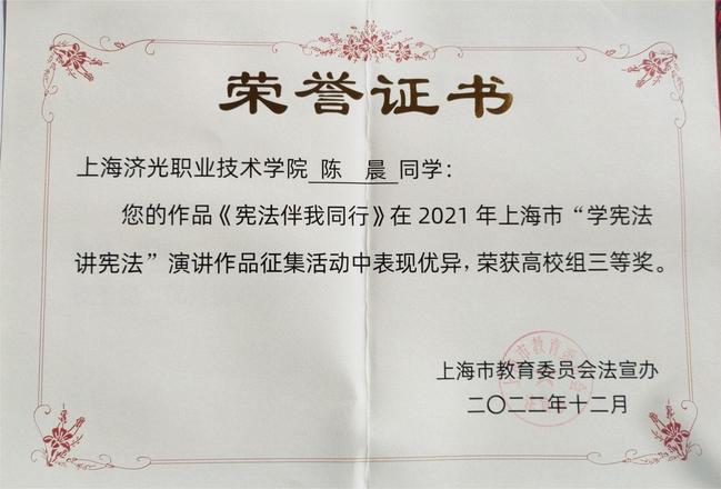 喜讯:我校人居环境与建筑设计学院陈晨同学荣获上海市高校大学生 “学宪法、讲宪法”演讲比赛三等奖