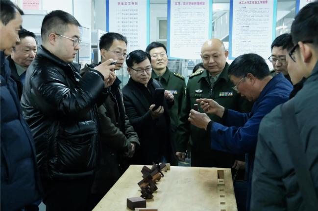 座谈会后,毛燕静老师带领来访人员参观了征兵工作站、退役军人服务站、国旗班活动室、“上海市劳模工匠育人基地”木工大师工作室以及建筑工程学院实践园。