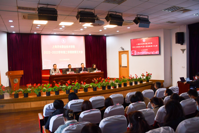 大会伊始,党委书记姜富明代表学校党政领导班子向全体教职员工致以新年诚挚的问候。随后,姜书记传达了2022年春季上海高校党政负责干部会议的主要精神。市委副书记诸葛宇杰在2023年春季上海高校党政负责干部会议中指出,党的二十大报告把教育、科技、人才工作单列为一个部分进行集中部署,充分体现了党中央对科技、教育、人才的高度重视;高校要为国家发展、区域经济和社会服务,专业的动态调整中要考虑专业建设和发展规律,要以国家战略为牵引,紧密结合区域经济和社会发展需求;上海作为全国的经济、金融、贸易、航运、科技五大中心,具有功能优势,在数字技术、创新领域等方面先发优势十分明显,这两大优势为高校带来了无可替代的发展机遇。市教卫工作党委书记沈炜对高校党的工作作了五方面工作指示:一是深入学习宣传党的二十大精神,把思想统一到党的二十大精神上来,把力量汇聚到党的二十大确定的各项任务上来,开展好主题教育工作,提升高校社会服务的能级水平;二是要把习近平总书记关于立德树人的重要论述领会到位、落实到位,全面贯彻党的教育方针,要用习近平新时代中国特色社会主义思想铸魂育人;三是高校各级党政班子领导要敢闯、要谋发展、要有干的劲头,要有严的纪律,强化党组织的政治功能和组织功能;抓好意识形态和安全稳定工作,针对学生普遍关切,思想困惑和需求,加强教育引导;全面从严治党,深入推进营造风清气正的政治生态推进。姜书记指出,推进职普融通、产教融合、科教融汇,优化职业教育类型定位,这些都对职业教育提出了更高的要求、给予了更高的期待。学校要进一步优化专业布局,主动对接产业升级和技术变革需求,建立适应产业需求的专业动态调整机制,持续推动校园数字化转型,提高师生信息化素养。姜书记对学校今年的工作提出了三点希望和要求:第一,以全党开展主题教育为契机,进一步深入领悟习近平新时代中国特色社会主义思想和党的二十大的精神,牢牢把握立德树人根本使命。第二,要把握高等教育、特别是职业教育趋势和要求,要将规划图、设计图变为施工图,要在发展中见人、见事、见物、见成效。第三,要自信自强,在良性竞争中坚持定力,不贪大求全,不搞“短、频、快”,以内涵式发展为目标,坚持改革发展是第一要务、坚持“强、特、优”的发展、坚持高质量发展。