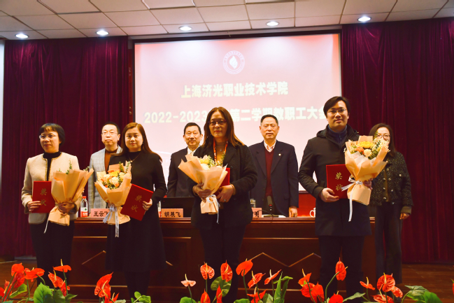 大会还表彰了获得第二届“同·济”奖教金的四个项目团体,党委副书记刘丽宣读了表彰决定,校党政领导为获奖代表颁发了荣誉证书。受表彰的项目团体分别是:人居环境与建筑设计专业群(获批上海第二批高水平高职专业群建设2022-2024)、数字化商务运营管理专业群(获批上海市高水平高职学校和专业群建设2022~2024)、酒店管理与数字化运营(获批专科高等职业教育应用本科专业贯通培养模式)、新型建筑工业化技术人才培养教学创新团队(获批2021年度上海高职高专院校市级教师教学创新团队立项)。
